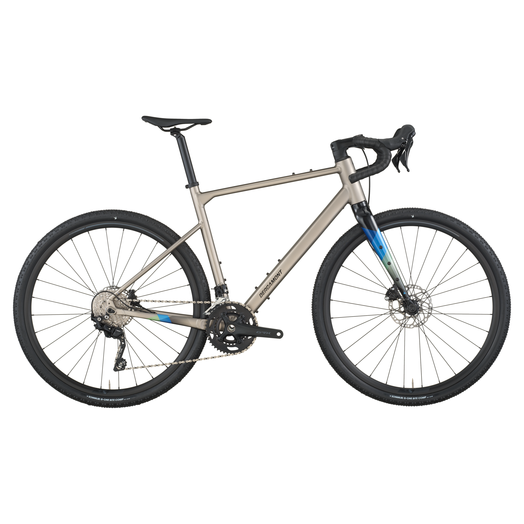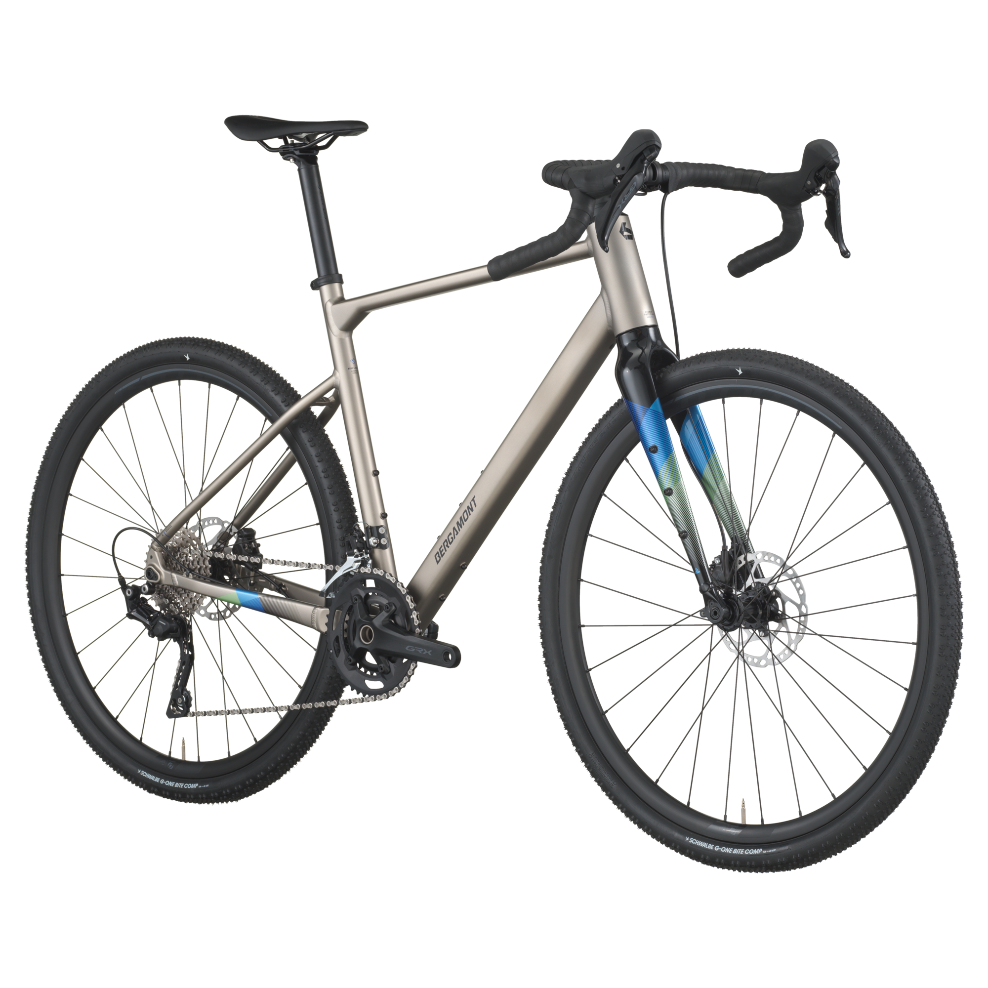 A multifunctional aluminum platform designed down to the last detail, with balanced all-road geometry, maximum tire clearance, numerous attachment points for accessories, and an innovative design. An eye-catching allrounder, equipped with sophisticated Shimano GRX 2×10-speed gravel components.
